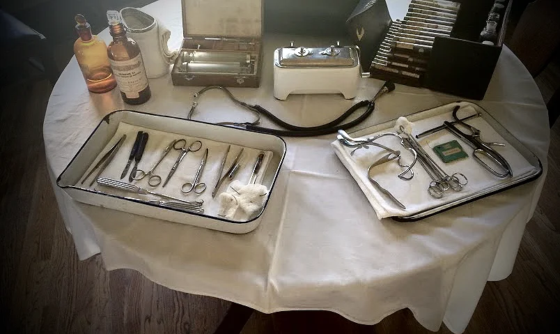 I worked primarily in the Cottage Hospital, a reconstruction of an isolated, nurse-run rural hospital with equipment from circa 1912 (and a few anachronistic post-war pieces). I entered the Cottage Hospital with no formal training in contemporary medicine, and only a ten-minute lecture from an experienced interpreter on how she recommended telling guests about the hospital. Upon my arrival on my first day, however, a coworker in elaborate white nurse’s garb promptly declared me a young lady doctor, gave me a crash course in the use of early-twentieth-century tonsillectomy equipment, and directed me towards a home remedy book called The People’s Home Library that interspersed remedies for various ills (if someone is choking, shake them upside-down by their ankles) with nuggets of medical wisdom (“all bleeding stops eventually”) before leaving me to pass this knowledge on to our guests.